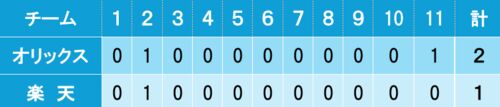 チーム 1 2 3 4 5 6 7 8 9 10 11 計 日本ハム 0 1 0 0 0 0 0 1 0 0 0 2 楽 天 0 0 1 1 0 0 0 0 0 0 1X 3 【日本ハム】 伊藤 上原 金村 ●斎藤(0勝2敗) 【楽天】 内 西口 藤平 鈴木翔 ○西垣(7勝0敗) [本塁打] レイエス32号(日) まず、内…